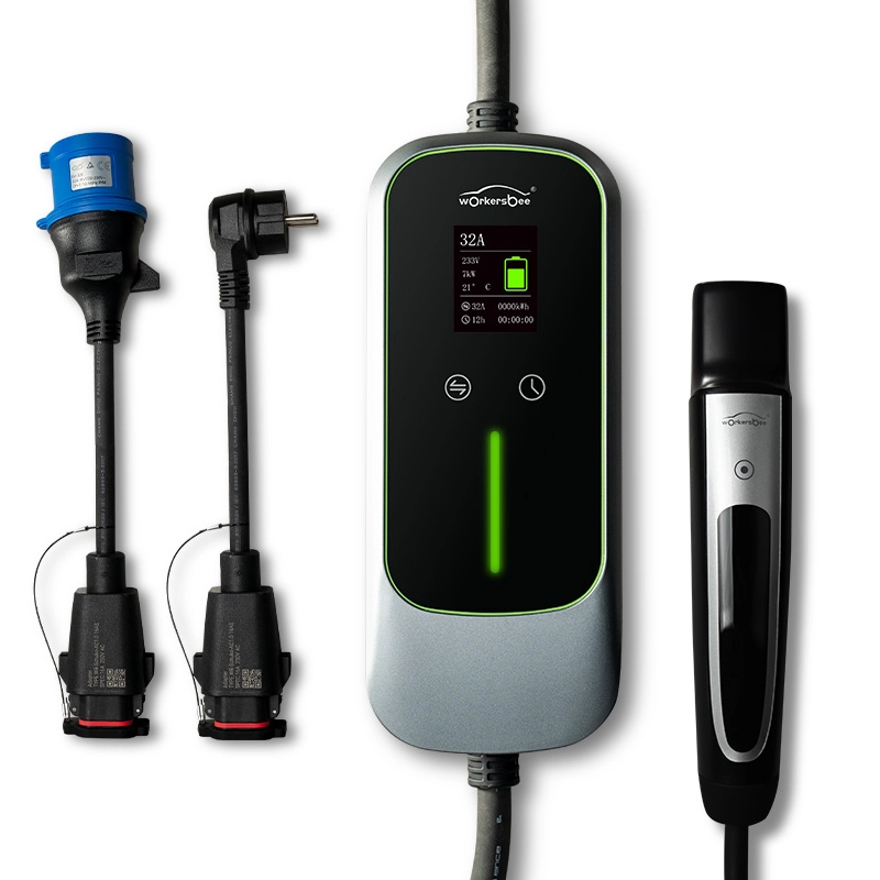 Workersbee'nin GB/T taşınabilir AC EV şarj cihazı (Mod 2 EVSE), IP67 sızdırmazlık, OLED durum göstergesi ve özelleştirilebilir fiş seçenekleri (CEE, Schuko, NEMA) ile 3,6–7,4 kW'a kadar 16A/32A şarj sağlar. Seyahat, ev ve filo yedeklemesi için CE/TÜV/UKCA sertifikalıdır.